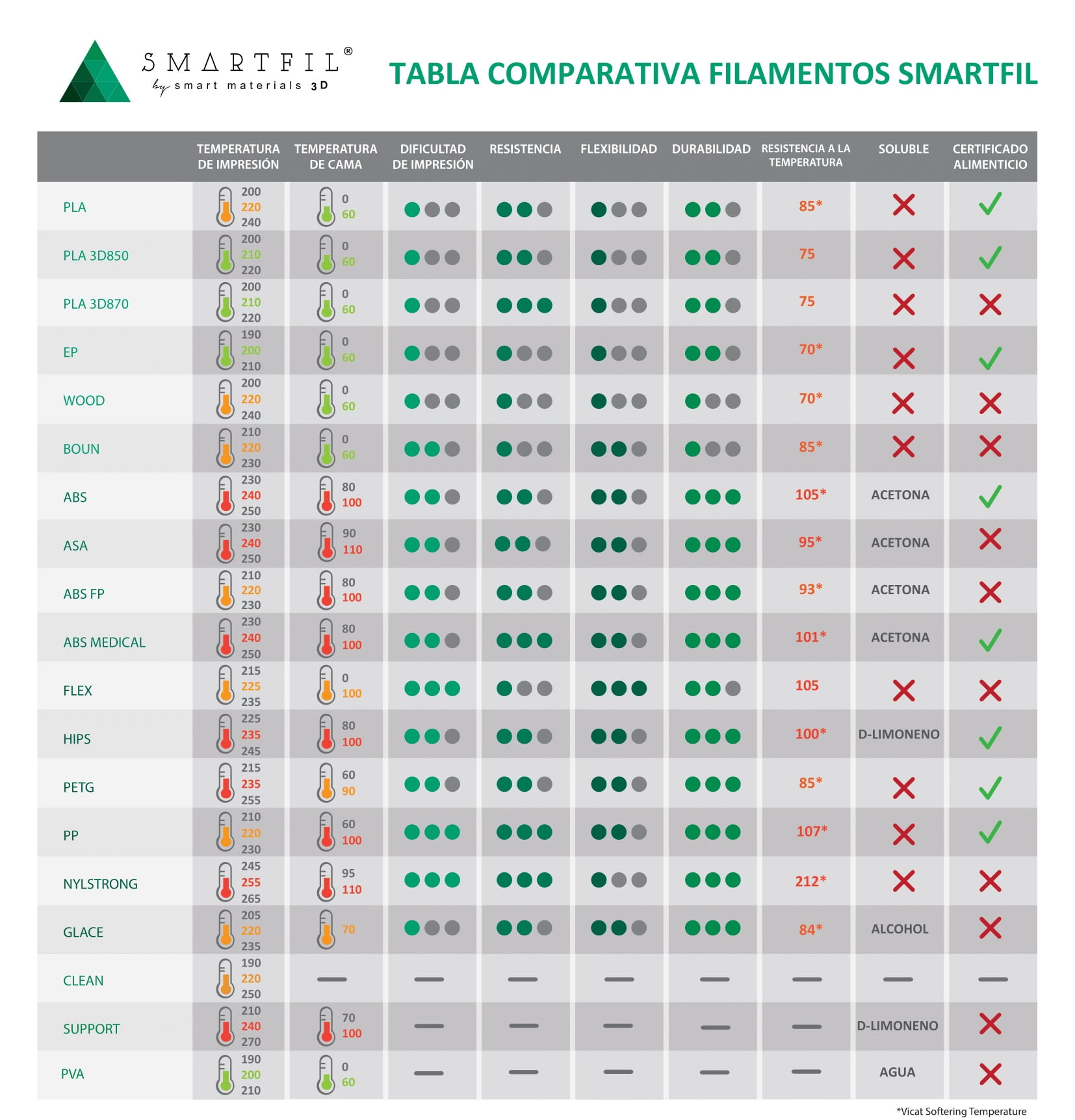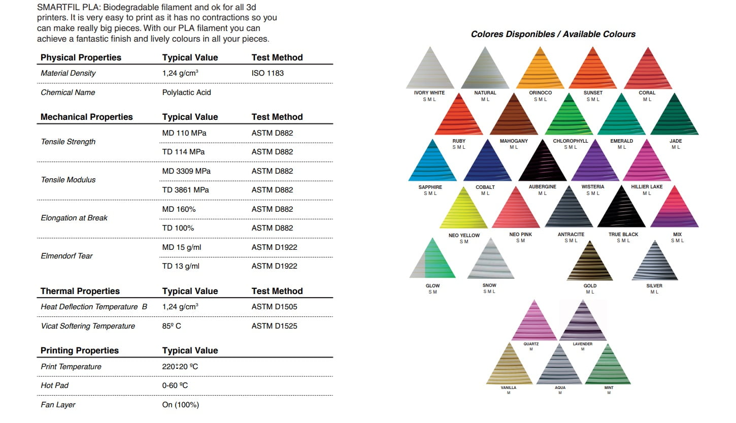 O filamento PLA é um polímero estável, permanente e inodoro. Como contrapartida do PLA em relação ao ABS cabe mencionar que a sua temperatura de amolecimento é de 60ºC em relação aos 100ºC do ABS.