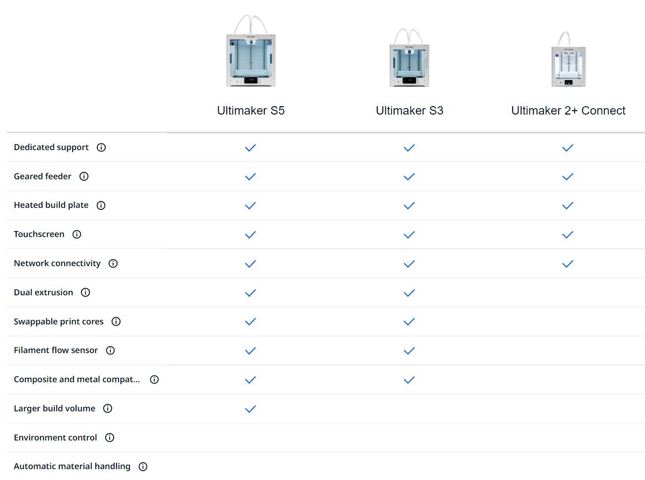 | – Todos os materiais de construção da Ultimaker — PLA, PLA Tough, ABS, CPE, CPE+, Nylon, PC, PP, TPU-A95 – Sistema de filamento aberto | |