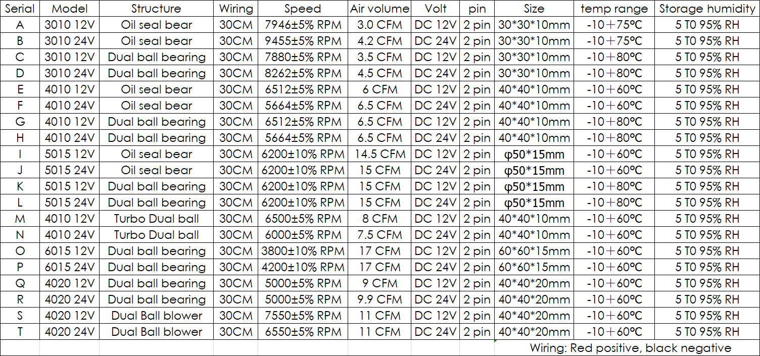 Caracteristicas: Wiring length 30CM, Noise 27 DBA, Speed 3800±5% RPM, air volume 17 CFM, DC 12V, Current 0.14 A, Power 1.68 W, 2 pin, 60*60*15mm, Bearing structure: Double ball bearing, Wiring: Red positive, black negative, Temp: -10+60℃, Storage: 5 T0 95% RH, Life More than 30000 Hours