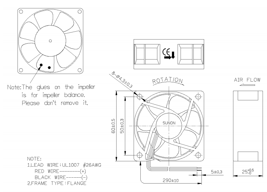 - Tamanho: 60x60x25mm - Voltagem: 24VDC - Voltagem operacional: 8..27,6VDC - Corrente: 750mA - Consumo: 1,25W - Material do invólucro e ventoinha: termoplástico PBT - Classe de isolamento: E - Tipo de rolamento: slide bearing - Velocidade de rotação: 4500 (±15%) rpm - Fluxo de ar: 39,93m3/h - Nível de ruído: 27dBA - Ligação: fios (2x AWG26 300mm) - Classe de inflamabilidade: UL94V-0 - Peso: 57g